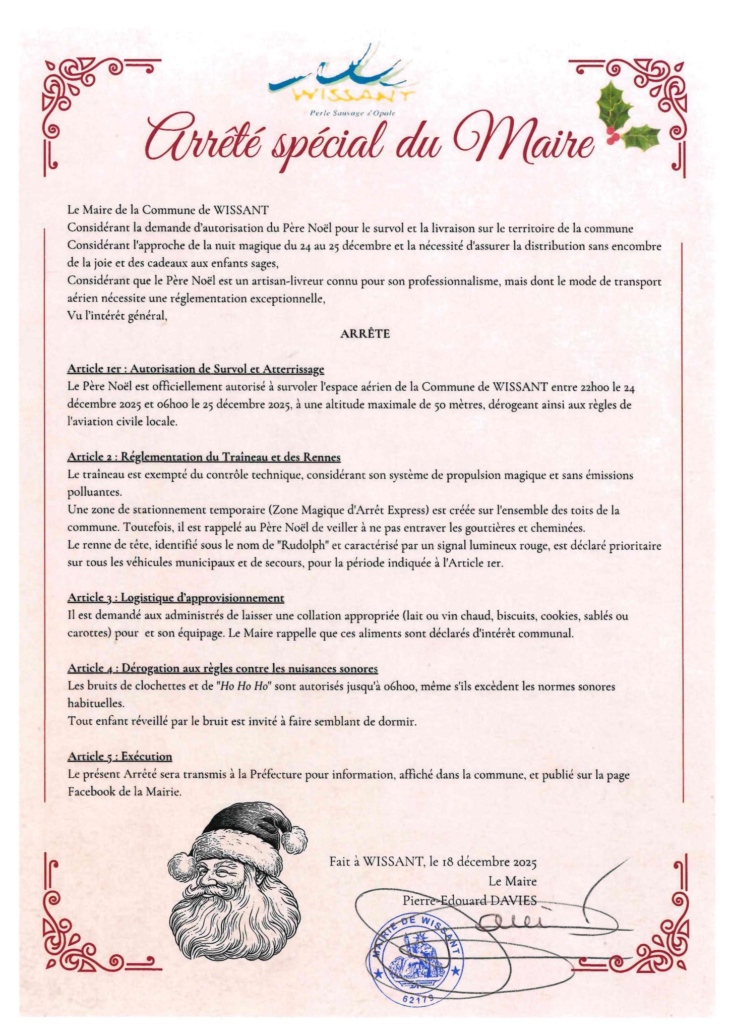 La magie de Noël s’invite aussi dans les arrêtés municipaux. Ce mercredi 24 décembre, la municipalité de Wissant a publié sur sa page Facebook un arrêté exceptionnel que le maire a signé pour permettre au Père Noël de survoler la commune et d’y déposer ses cadeaux.