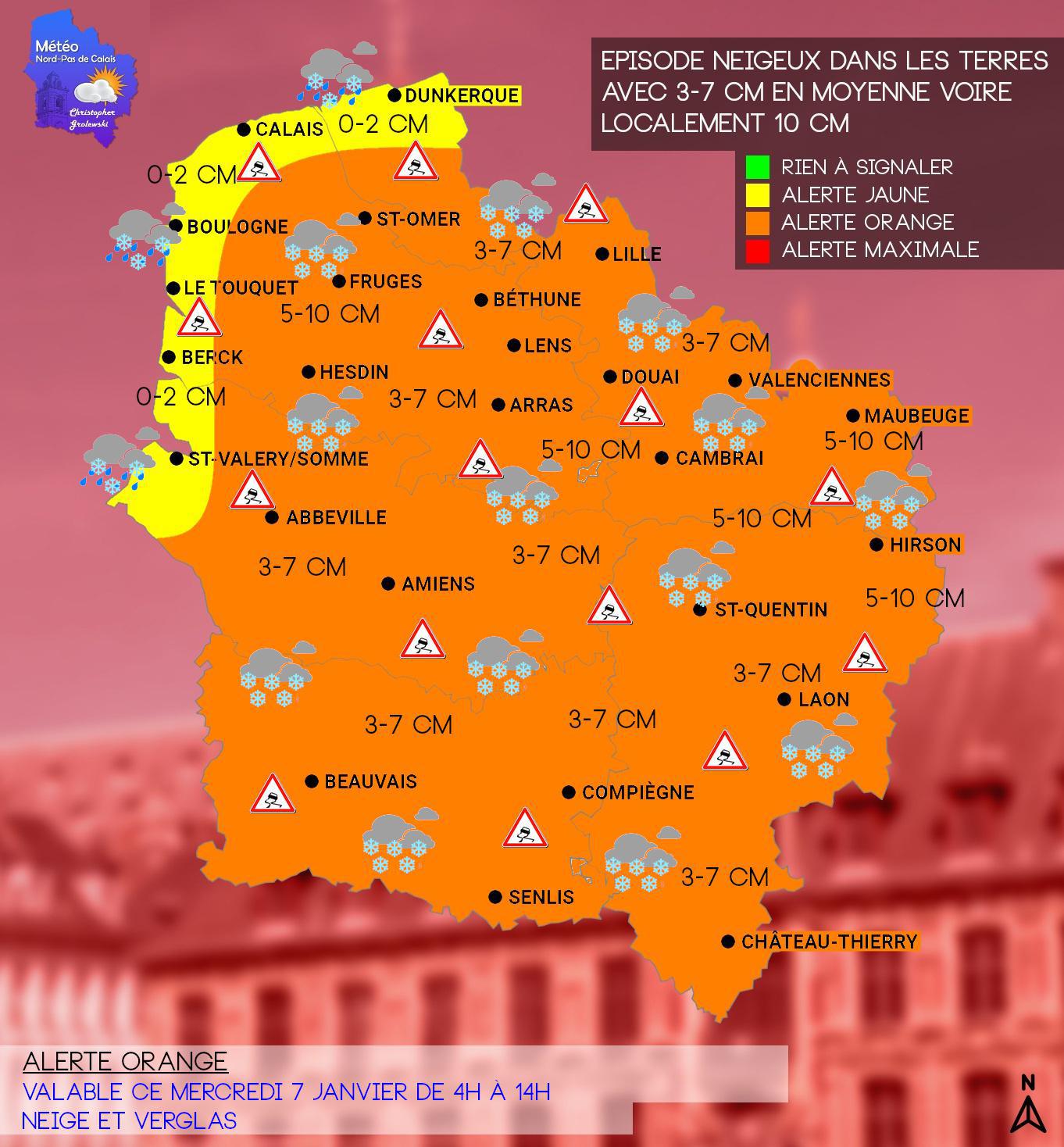 Un épisode neigeux est attendu ce mercredi sur la région à l'exception du littoral. Les cumuls de neige seront généralement compris entre 3 et 7 cm voire localement jusqu'à 10 cm entre l'Avesnois-Thiérache et les collines de l'Artois. Quelques petites congères seront possibles localement puisque l'on attend des rafales comprises entre 50 et 65 km/h. Sur la côte, les sols pourront temporairement blanchir, mais la fonte sera assez rapide avec le redoux.