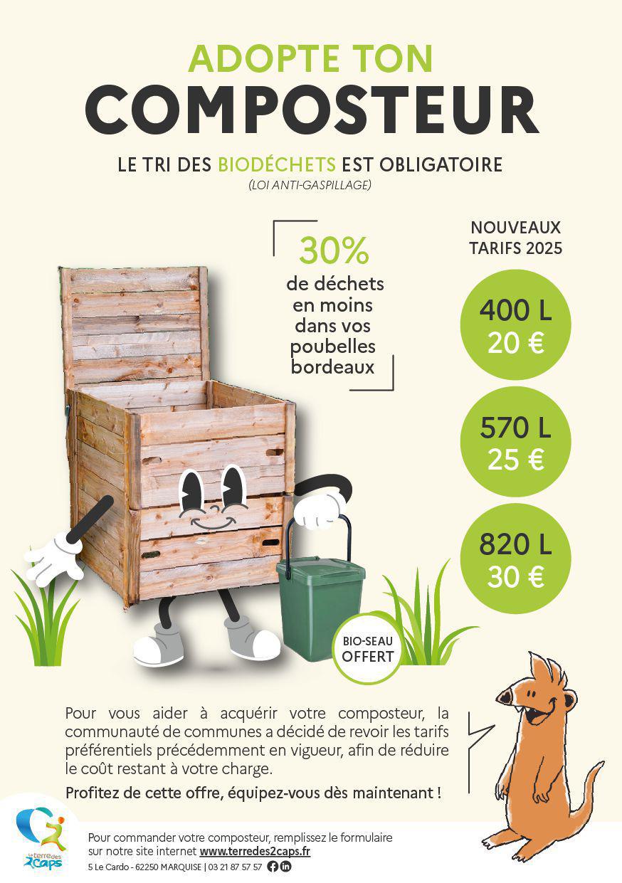 30 % de nos biodéchets alimentaires quotidiens sont compostables. La Communauté de Communes (CCT2C) propose des composteurs individuels à tarif préférentiel. Commande en ligne sur www.terredes2caps.fr, ou au 03.21.87.57.57.