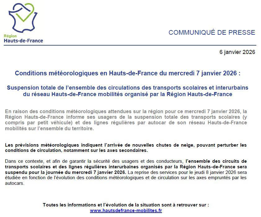 La Région a décidé la suspension totale de l’ensemble des circulations de transports scolaires et interurbains du réseau Hauts de France mobilités pour la journée de ce MERCREDI 07 JANVIER 2026.