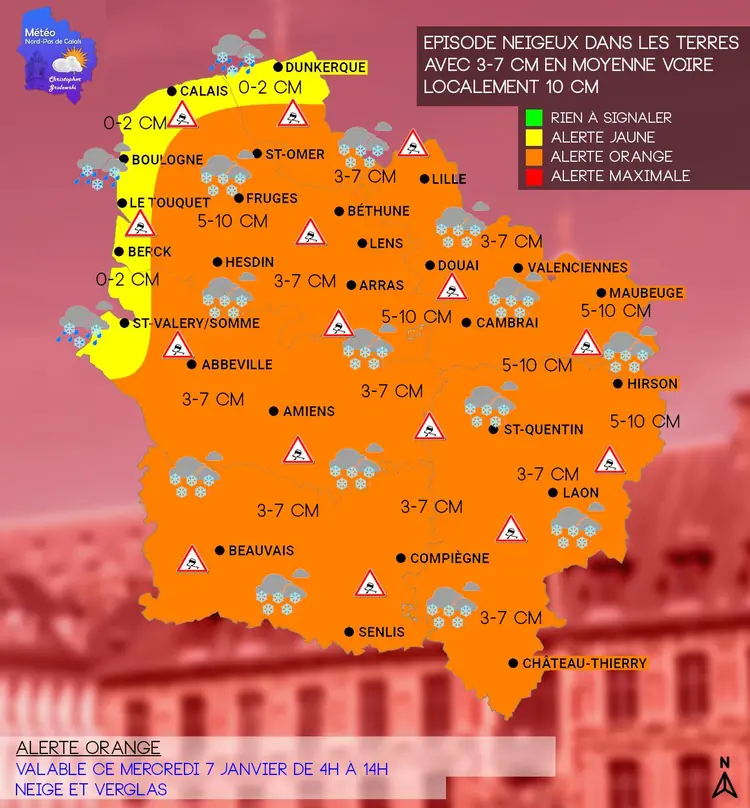 Un épisode neigeux est attendu ce mercredi sur la région à l'exception du littoral. Les cumuls de neige seront généralement compris entre 3 et 7 cm voire localement jusqu'à 10 cm entre l'Avesnois-Thiérache et les collines de l'Artois. Quelques petites congères seront possibles localement puisque l'on attend des rafales comprises entre 50 et 65 km/h. Sur la côte, les sols pourront temporairement blanchir, mais la fonte sera assez rapide avec le redoux.
